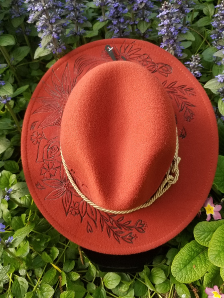 Drawn with fire, embellished with flowers and finished with a band of rope.